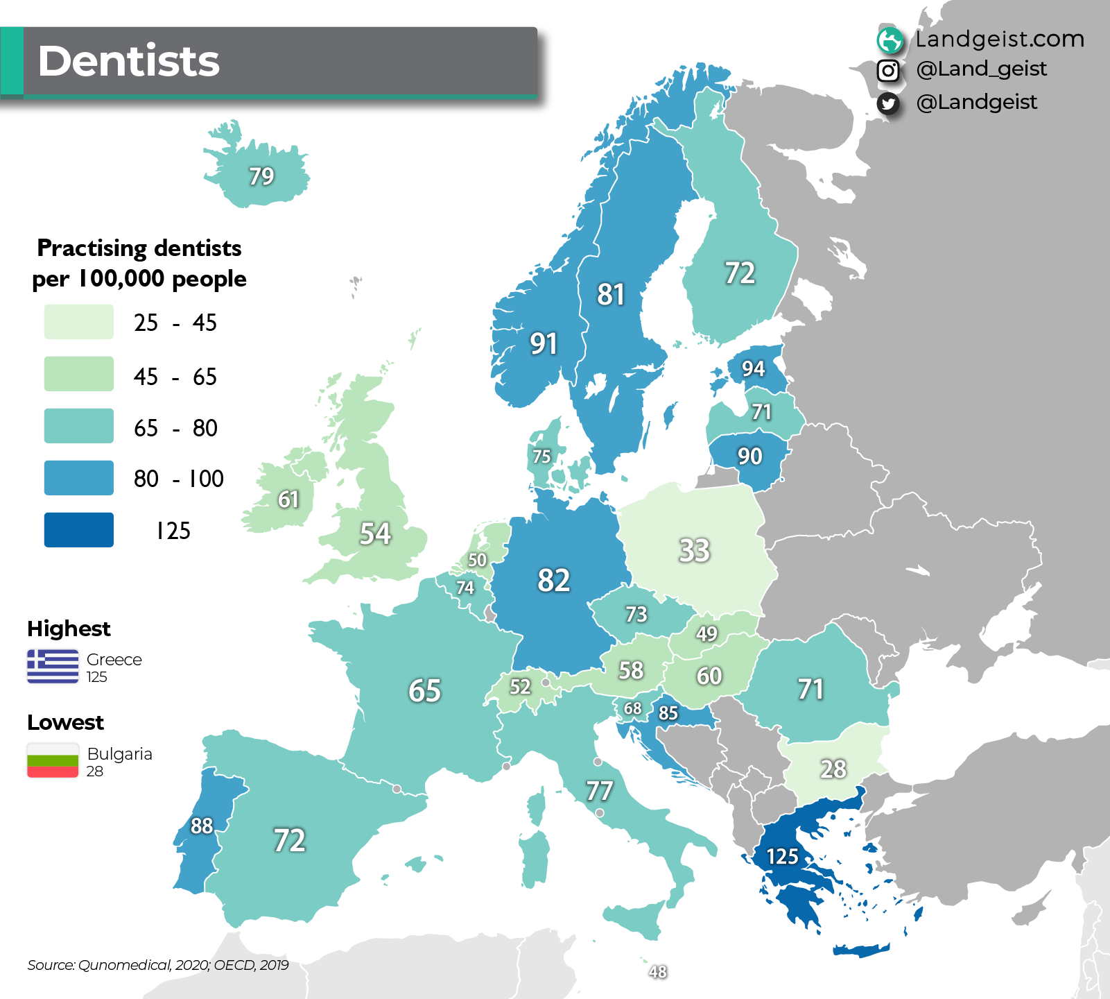 The highest ranking countries in the Healthiest Teeth Index (that are on this map) were Germany, Italy and Spain. The lowest ranking were Latvia, Slovakia and Croatia. We can already see some interesting things. Croatia has one of the highest numbers of dentist per 100,000 people, but has the worst dental health in Europe, according to Qunomedical. Greece, which has the highest number of dentists per 100,000 people, has a pretty low score on the Healthiest Teeth Index.