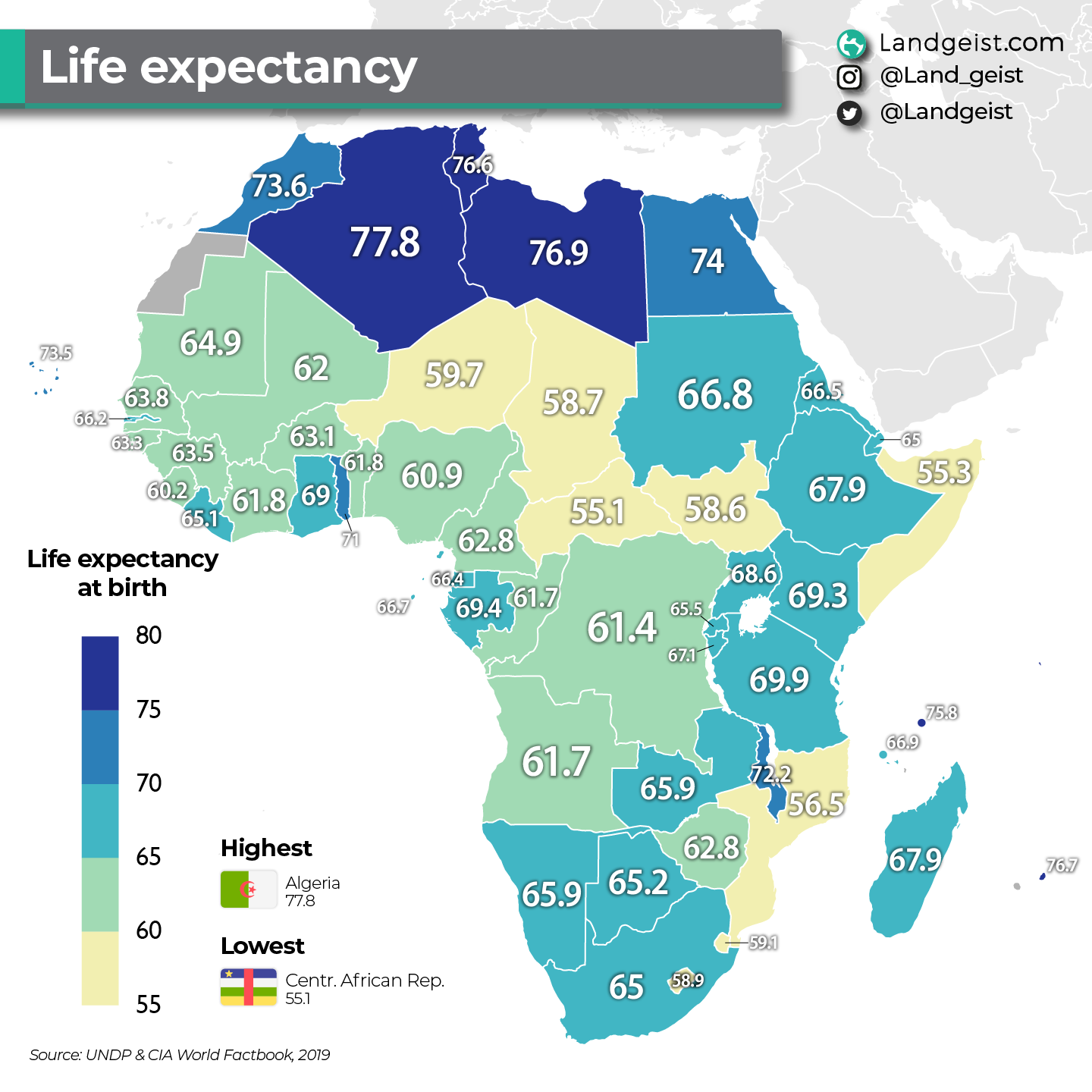 We can see that life expectancy in Africa is highest north of the Sahara and parts of Eastern and Southern Africa. Life expectancy is highest in Algeria (77.8), followed by Libya (76.9) and Mauritius (76.7).