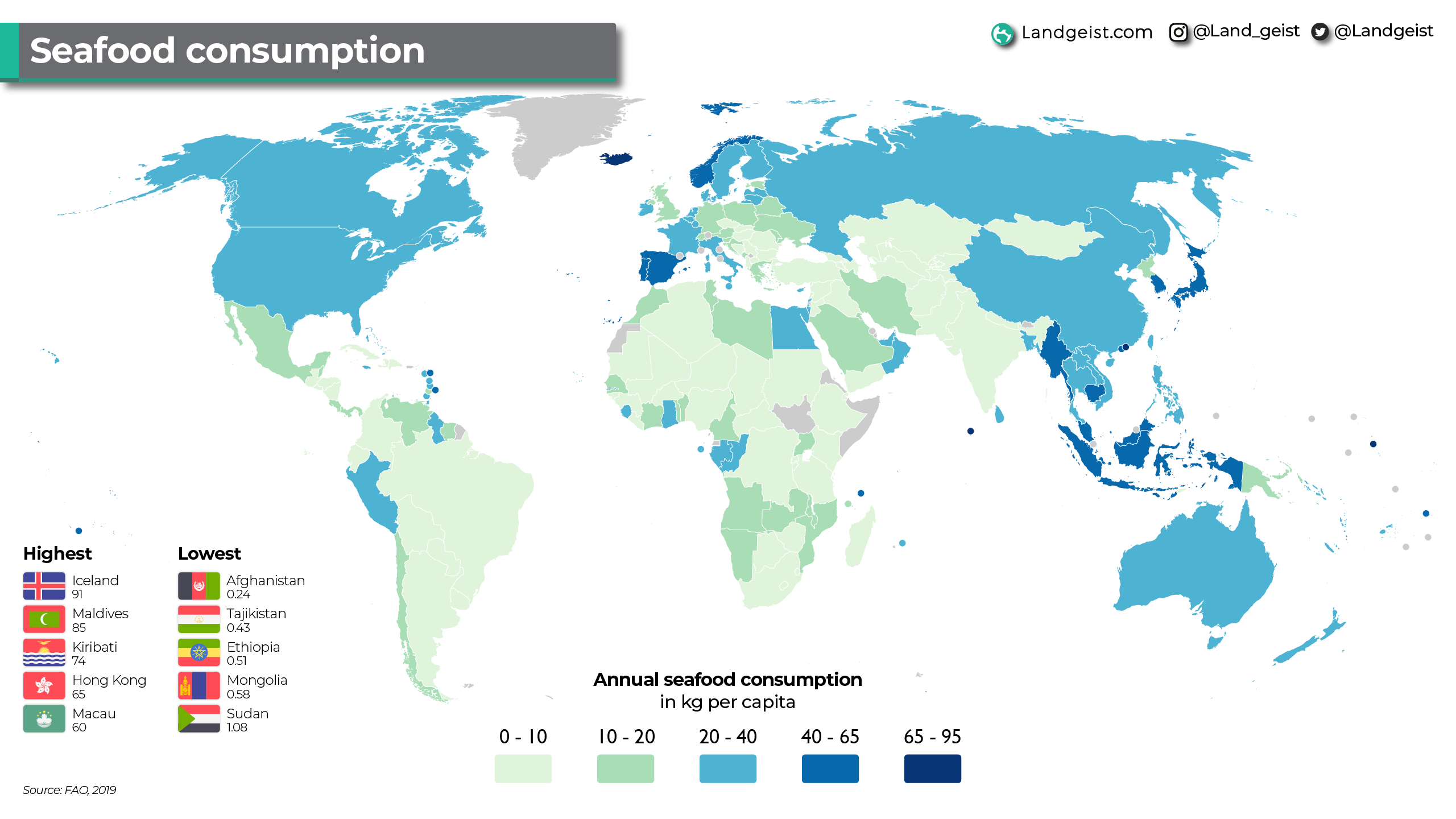 Not surprisingly, the lowest seafood consumption can be found in landlocked countries: Afghanistan, Tajikistan, Ethiopia and Mongolia all consume less than 1 kg of seafood per capita per year. The number 5, Sudan, is an interesting outlier. As it actually isn’t landlocked, but borders the Red Sea.