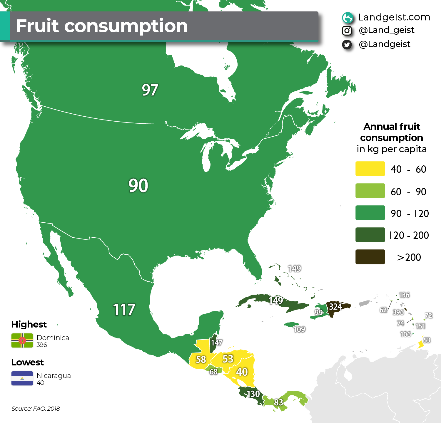 The biggest consumers of fruit per capita in North America is Dominica, where people consume an average of 396 kg of fruit per capita per year. The Dominican Republic comes in second, with 324 kg of fruit. Saint Vincent and the Grenadines is third, with 151 kg.