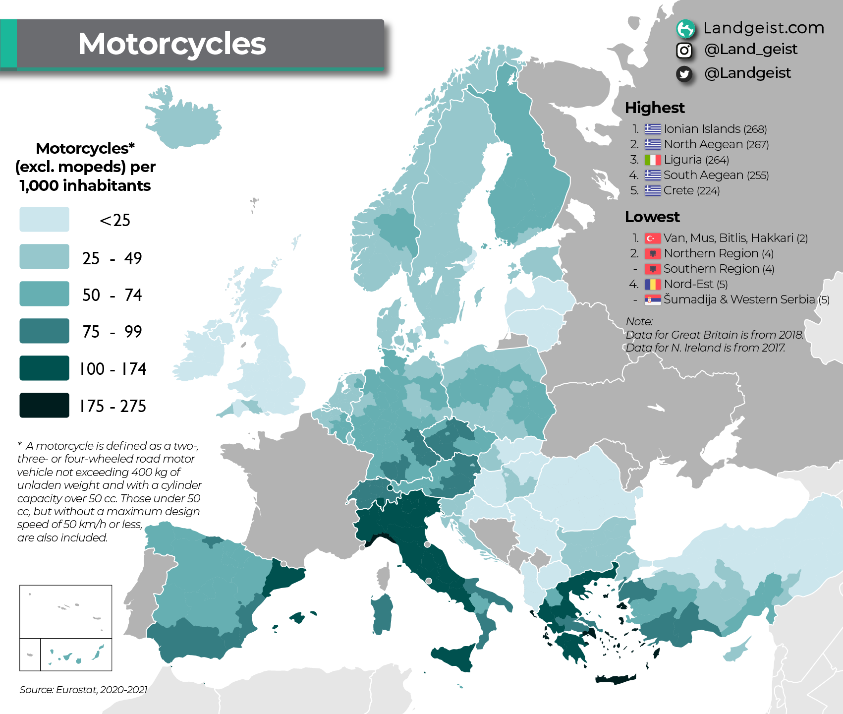 Data for this map comes from Eurostat. Eurostat defines a motorcycle as a two-, three- or four-wheeled road motor vehicle not exceeding 400 kg of unladen weight and with a cylinder capacity over 50 cc. Those under 50 cc but without a maximum design speed of 50 km/h or less, are also included. This means vehicles like quad biked are also included. Mopeds, however, are not included, unless it does not have a maximum design speed of 50 km/h or less.