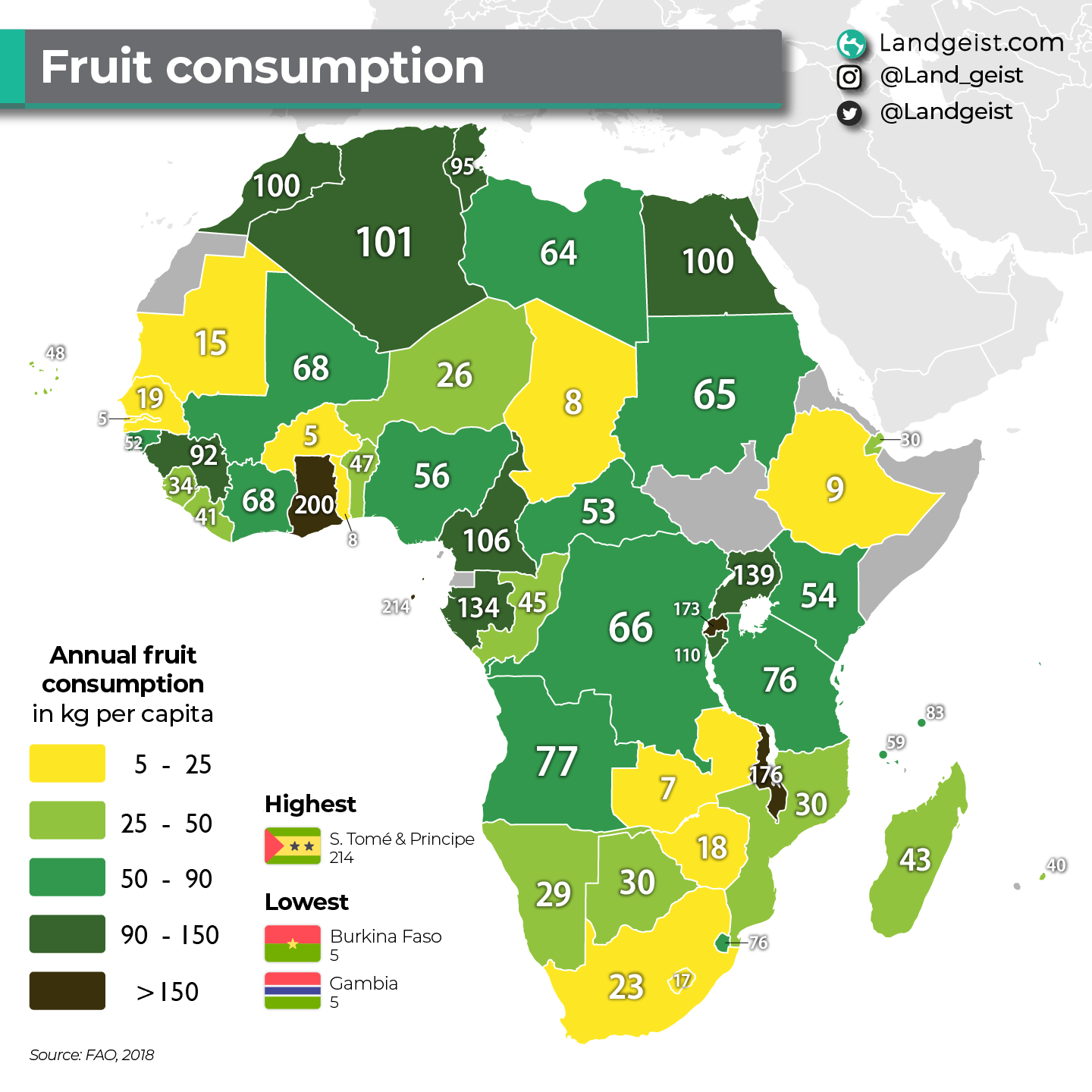 The lowest fruit consumption can be found in Burkina Faso, Gambia (5 kg), Chad and Zambia (7 kg).
